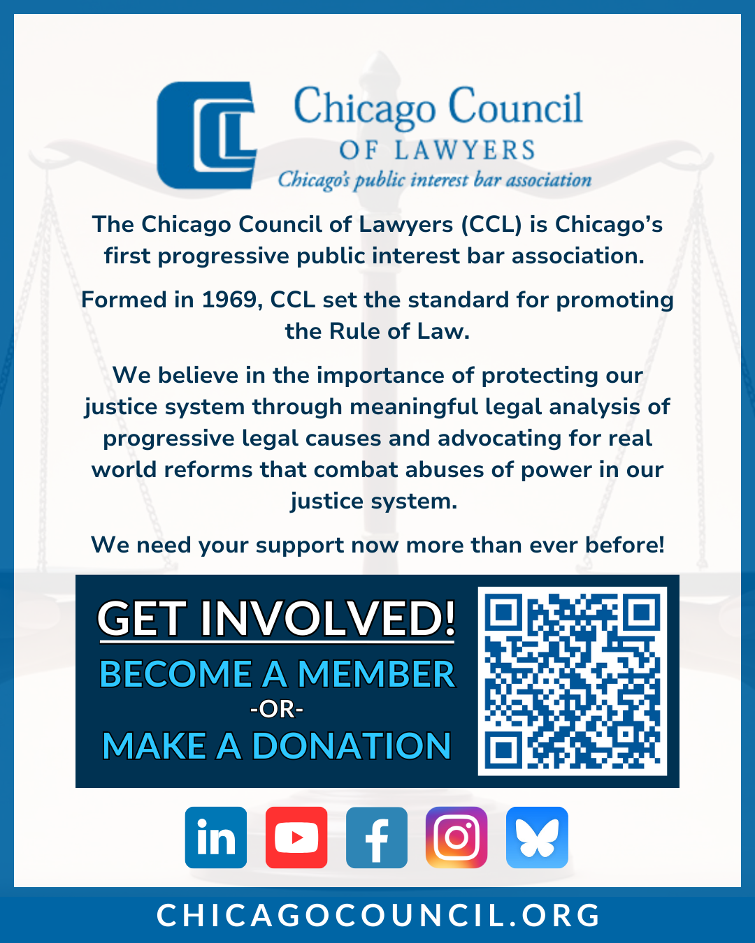 The Chicago Council of Lawyers, Chicago’s public interest bar association, brings lawyers together not to advance professional self-interest, but to strengthen the justice system by insisting that it honor the principles that animate constitutional governance: fairness, human dignity, personal autonomy, compassion, and fidelity to truth. At a time when policies of the Trump Administration repeatedly transgress those principles, the Council’s independent voice is more important than ever.