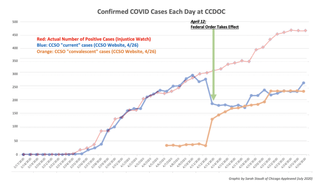 After the Sheriff was ordered by the court to institute social distancing, PPE, and sanitation, the rate of new cases in the jail finally began to plateau. Though the Sheriff credits himself, the fact is that the spread of COVID-19 was brought relatively under control because of the hard work of everyone involved: the CCSO staff, the lawyers who initiated the suit, and the jailed individuals themselves – who all provided vital information about conditions and were instrumental in encouraging PPE use, social distancing, and sanitation among their peers – and efforts by activists whose advocacy successfully dropped the total jail population by over 1,000 people between the end of March and the beginning of May.