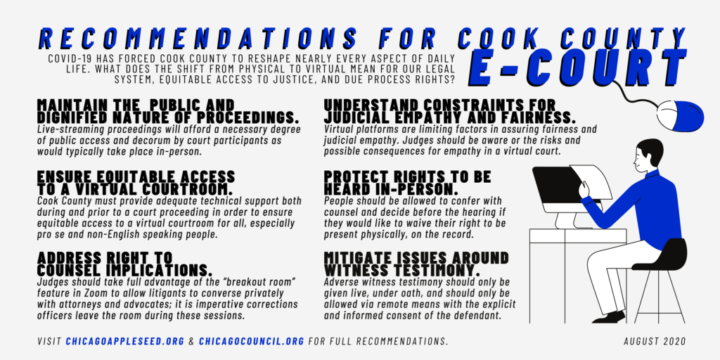 As highlighted in our full report, virtual court in Cook County introduces new obstacles to people’s due process and access to counsel rights. In our “Cook County E-Court” report, Chicago Appleseed and the Chicago Council of Lawyers make recommendations to address several of these equity, ethics, and constitutional issues.
