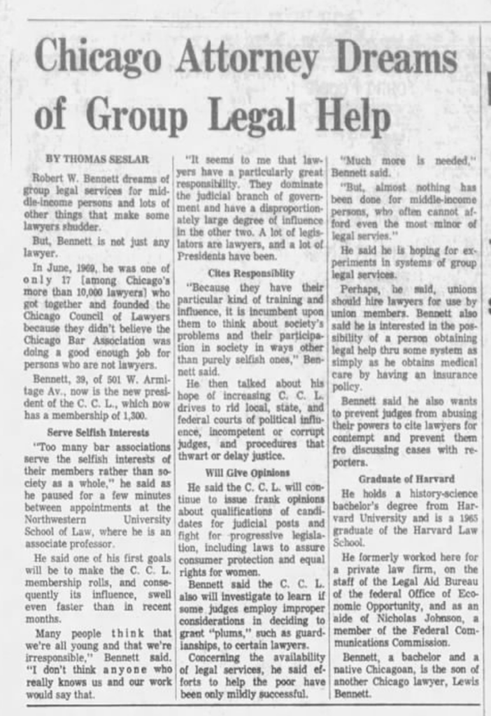 • 1974—We successfully challenged restrictions imposed by a Federal District Court on public comment by attorneys in Chicago Council of Lawyers v. Bauer – a major victory for free speech.