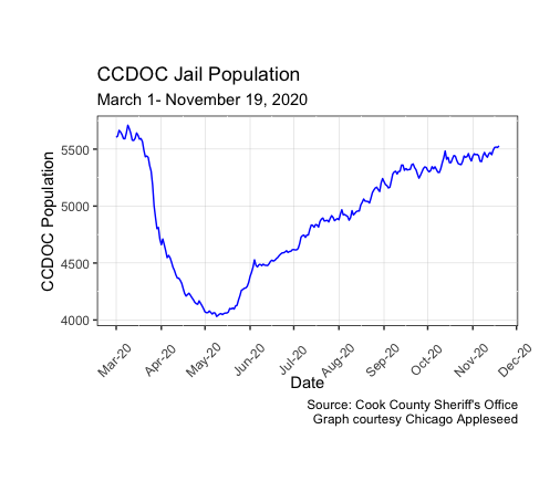 Our concern with Dart’s premature declaration of victory was, unfortunately, warranted. Today, the Cook County Jail population is significantly higher than it was in the Spring, with 5,511 people inside. On November 16, 2020, 85-year-old Harold Graszer died while awaiting trial; he was the eighth person known to have died from COVID-19 complications while in the custody of the Sheriff, and the first to die in over 7 months, since William Sobczyk on May 6, 2020.