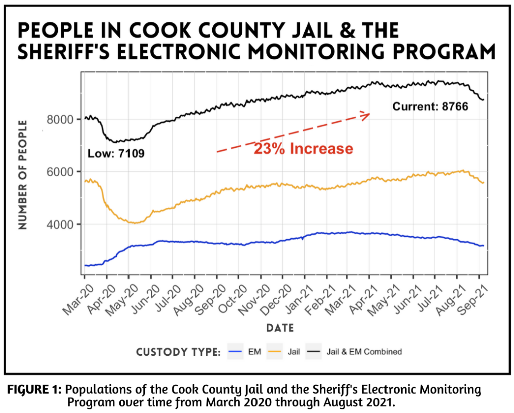 Currently, over 8,700 people in Cook County are on electronic monitoring or in Cook County Jail. For the first time in years, the total number of people incarcerated in Cook County is steadily growing, not shrinking, with people being surveilled longer than ever although most people do not violate pretrial conditions put in place by a judge.