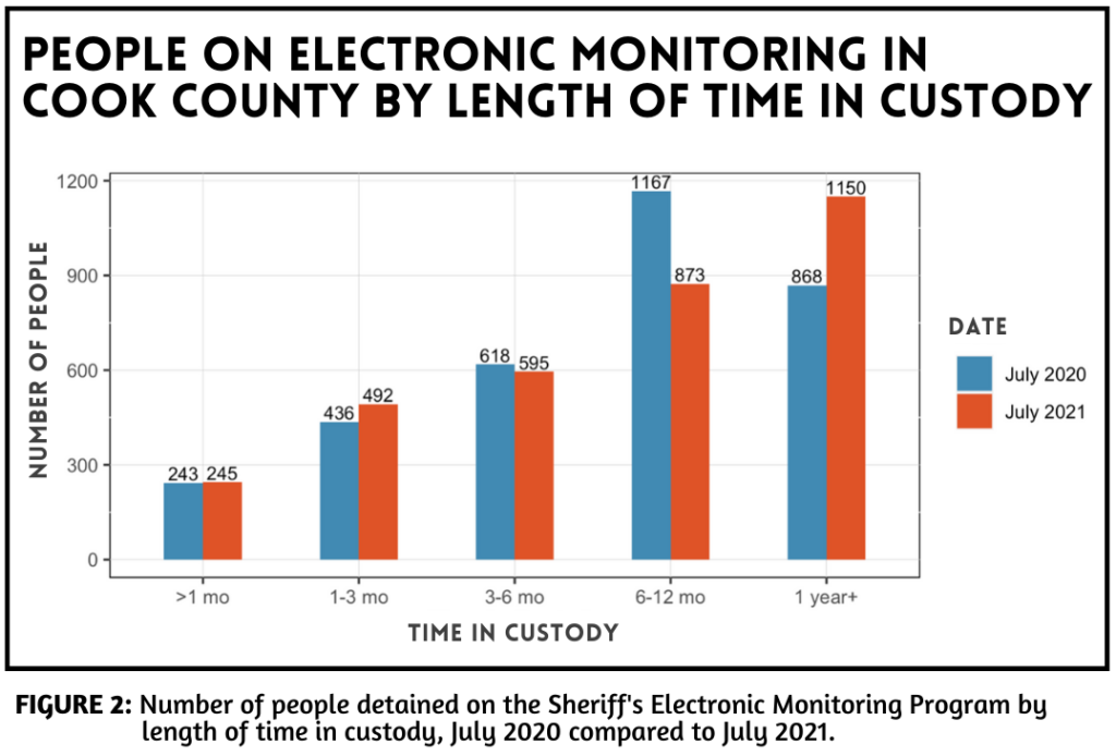 Currently, 1,150 people in the Chicago area are on electronic monitoring and have been for over a year. This is 32% higher than the same time last year. At least 78% of people on the Sheriff’s EM have been detained for at least 3 consecutive months.