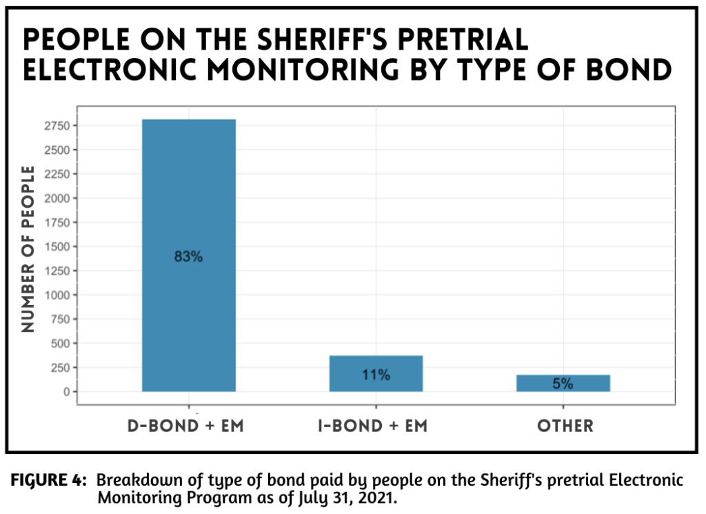 As of July 31, 2021, about 83% of the people on electronic monitoring in Cook County (2,821 of 3,357 people) were marked as having paid a D-Bond (10% of the full bond amount) with electronic monitoring, meaning they had to meet both conditions in order to leave the jail and begin house arrest.