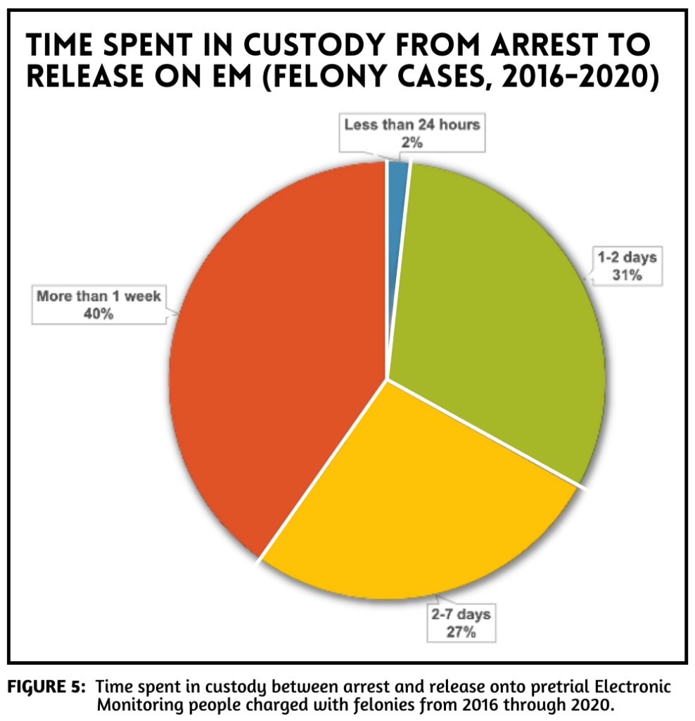 Over two-thirds of the people who spent 24 hours in jail after being arrested by the Chicago Police Department (CPD) were there for at least 2 days before beginning electronic monitoring; 40% of these people were in Cook County Jail for over a week.