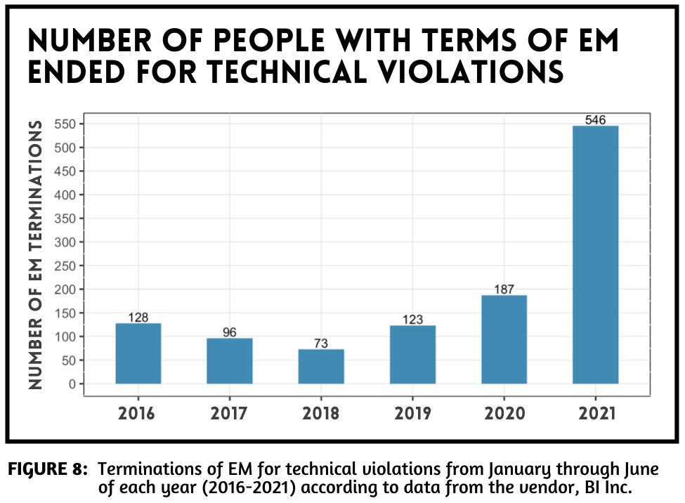 People on EM can be re-incarcerated by the Sheriff’s Office if they are alleged to have broken the rules of the program by leaving their homes when they were not authorized to do so. These are technical violations; people can be violated for being late returning from work, going to a doctor’s appointment or the hospital without authorization, or taking out their trash.