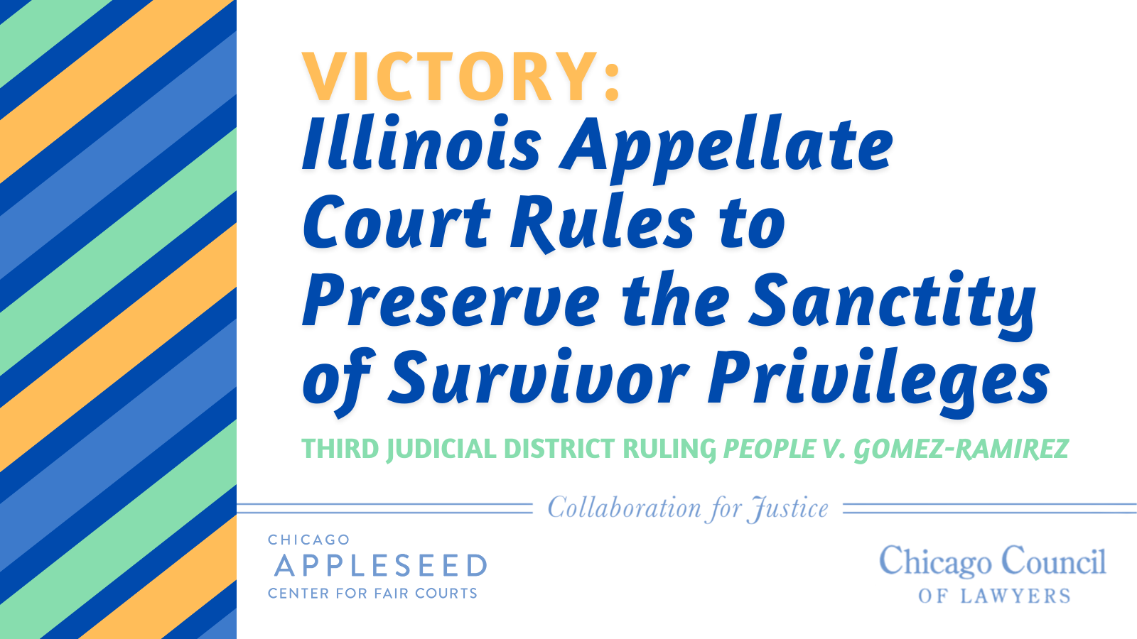 On Friday, July 10, Chicago Appleseed and Chicago Council of Lawyers submitted an amicus brief in the Illinois Appellate case of People v. Gomez-Ramirez (AMITA Health Adventist Medical Center, Bolingbrook, and Alexian Brothers-AHS Midwest Region Health Co., Contemnors-Appellants). Our pro bono partners at DLA Piper served as counsel for the amicus brief, filed in support of AMITA Health. Attorneys at the Illinois Coalition Against Sexual Assault, National Crime Victim Law Institute, and the Chicago Alliance Against Sexual Exploitation (CAASE) filed an additional brief in support of the appellants. The brief filed by Chicago Appleseed and Council of Lawyers focused on the issue of the State’s Attorneys’ improperly asserted right (under the defendant’s Sixth Amendment rights and the State’s duty to share exculpatory evidence in its possession) to search the health records of a victim on behalf of a defendant in a sexual assault case. The coalition of advocates on behalf of sexual assault survivors briefed on the issue of crime victim’s right to notice and an opportunity to be heard under the Constitution and the Rights of Crime Victims and Witnesses Act and the impact of the State’s attempt to obtain otherwise privileged documents.